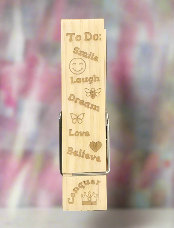 Stay inspired and organized with this Motivational “TO DO” Clothespin Decor, featuring uplifting words like Smile, Laugh, Dream, Love, Believe, and Conquer.